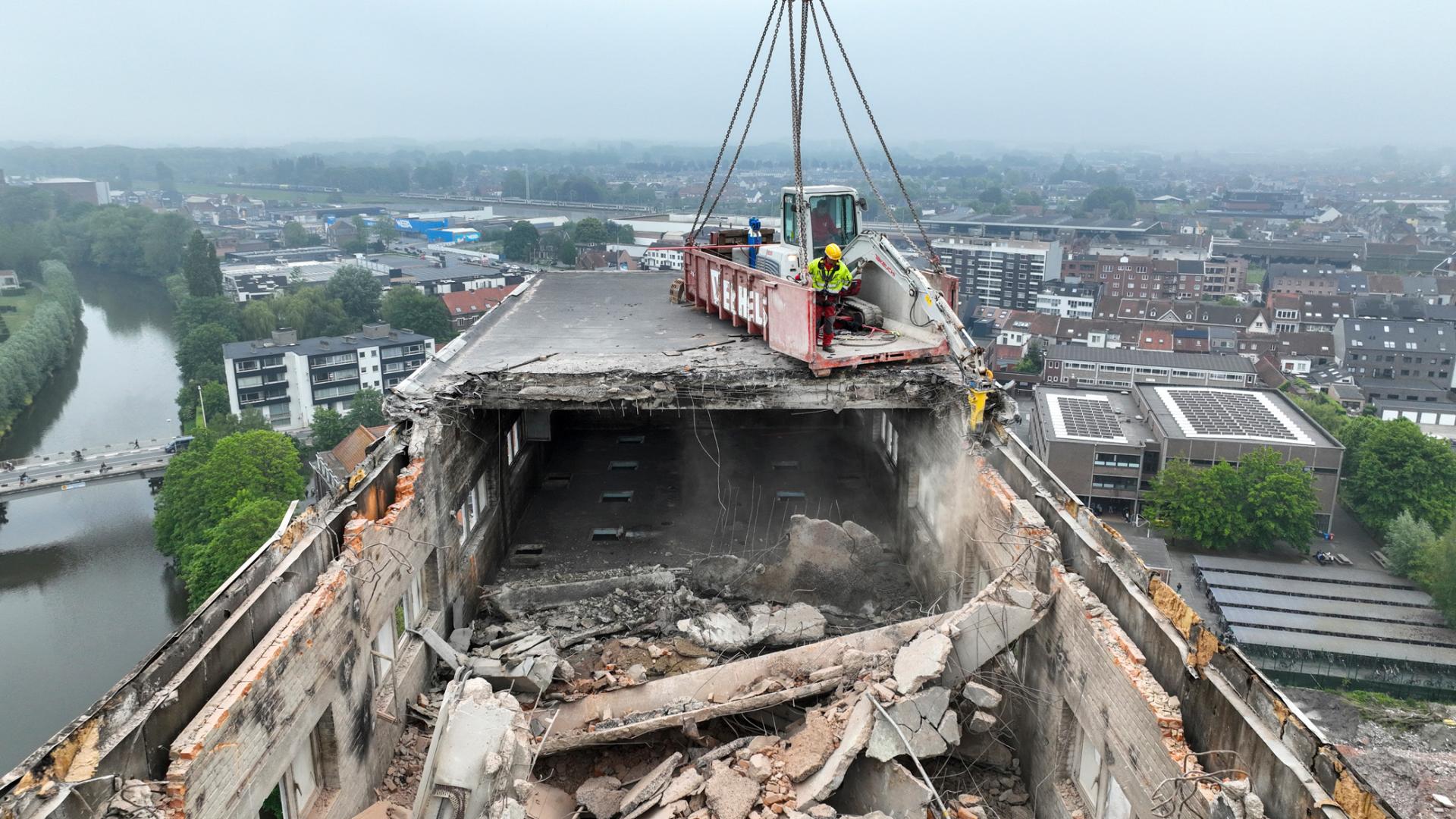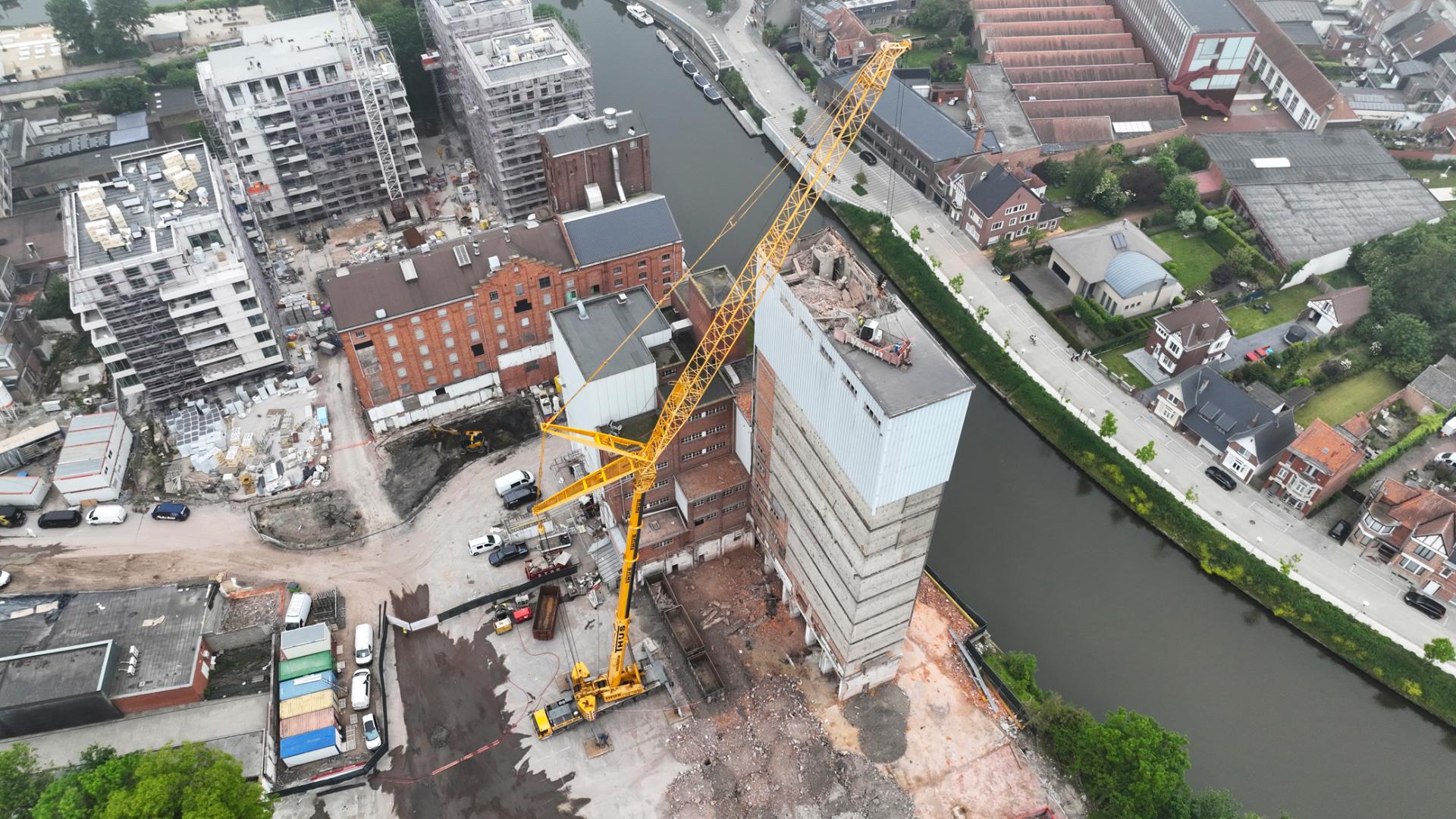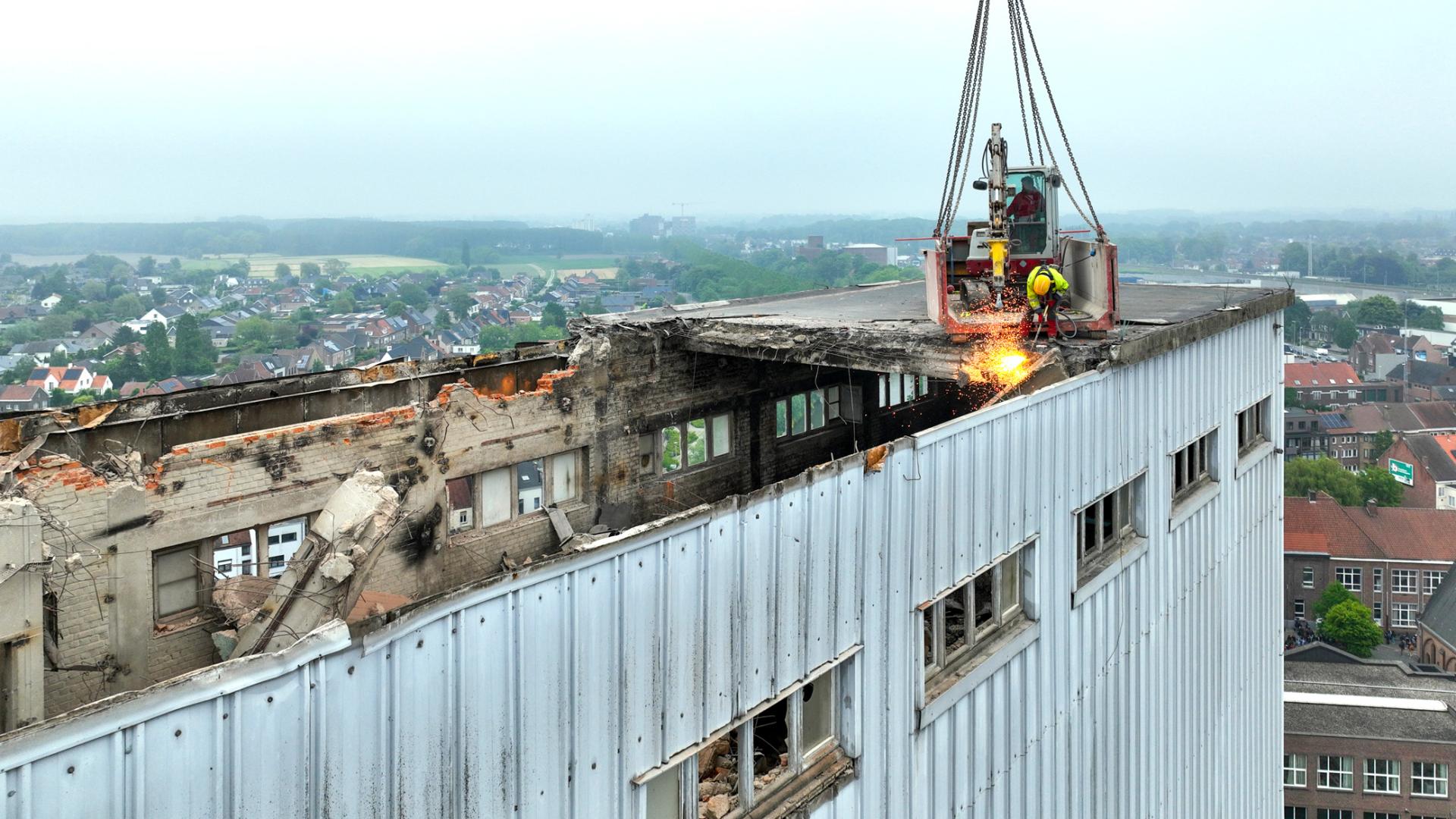 The location of the tower next to the Leie created a unique situation where demolition could be approached from only one side. To address this, we developed a creative approach. We placed a Mini Crane in a container, which was then hoisted up to demolish the top 15 meters of the tower. From then on, the demolition could continue from the ground with our Volvo 750 with long demolition arm.