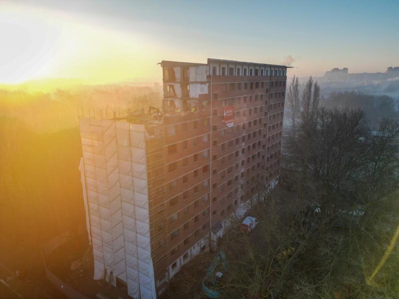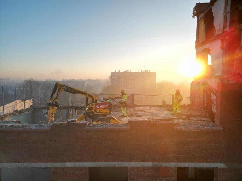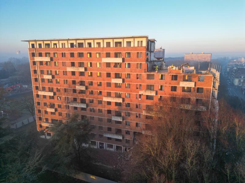 For the second year in a row, we successfully demolish an apartment building in Lille. Together with our French sister company Helfaut Travaux, we take on these complex projects. The building is close to the road, which makes the use of conventional demolition methods too risky due to potential falling debris. Since closing the road is not an option, we developed a smart and thoughtful approach.