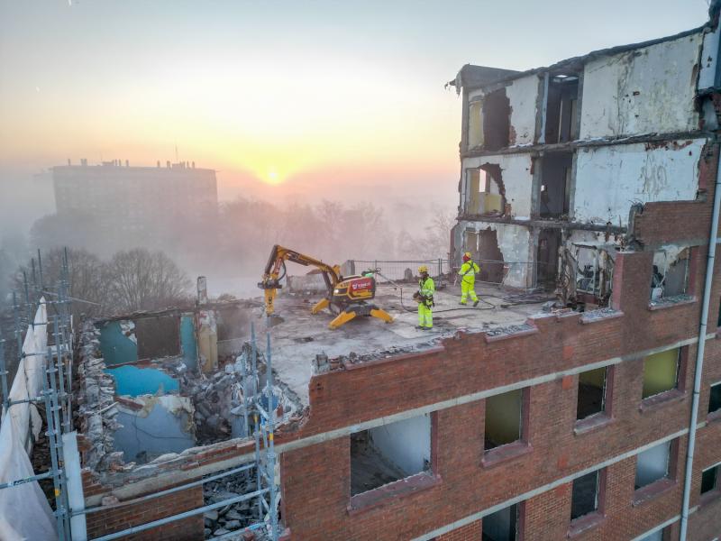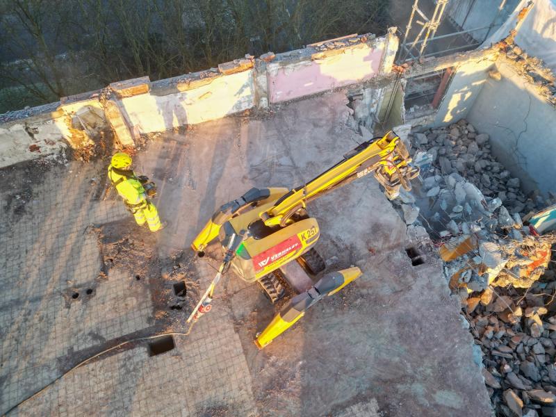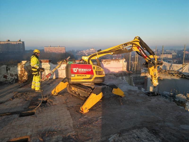- Demolition robot: For the part of the top five floors closest to the road, we use a demolition robot. This robot demolishes walls and floors per floor, with the debris ending up on the level below each time. This prevents debris from falling out uncontrollably.