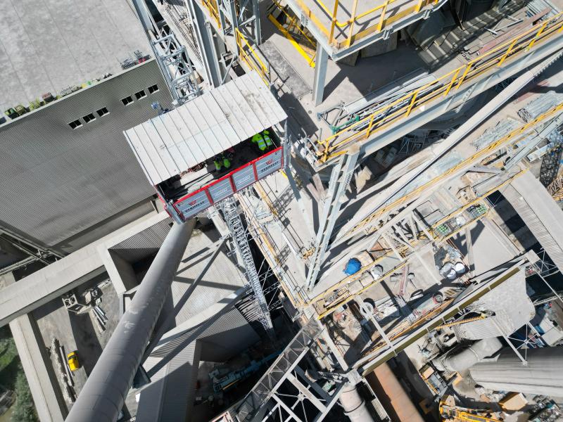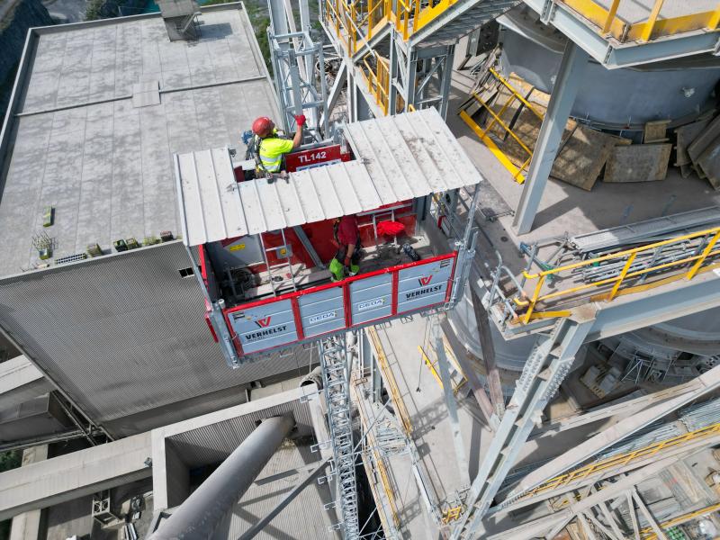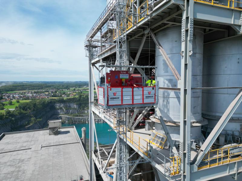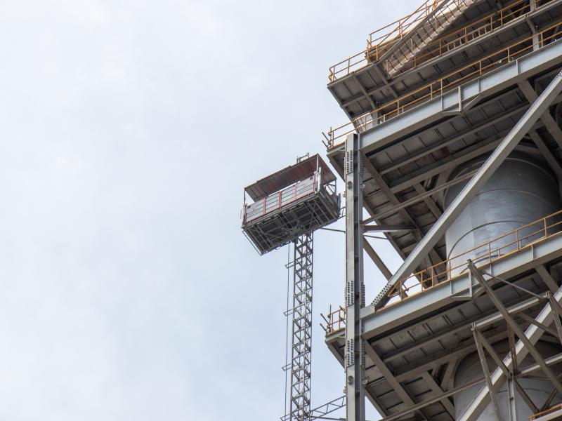 Pour ces travaux, il est nécessaire d'avoir une solution qui facilite le transport de matériel et de personnes à une hauteur de 100 mètres. Nous avons choisi d'installer un Geda 2500Z/ZP, qui peut transporter jusqu'à 7 personnes ou 2500 kg de marchandises à la fois. Le monte-charge monte à une vitesse de 12 mètres par minute pour le transport de personnes et 40 mètres par minute pour le matériel.