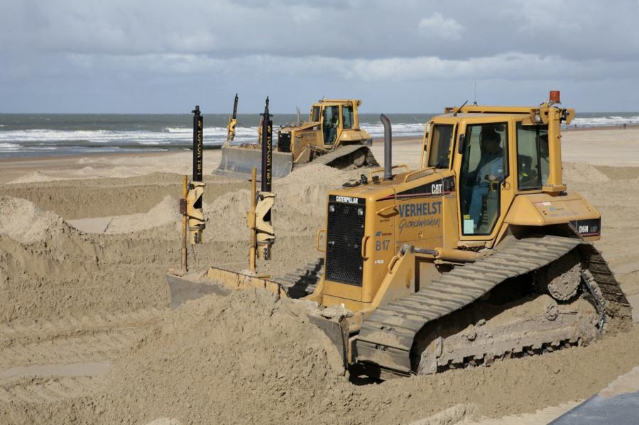 Ophogen en effenen van stranden na de inwerking van de getijden die tijdens de winter jaarlijks heel wat kubieke meters zand meesleuren.