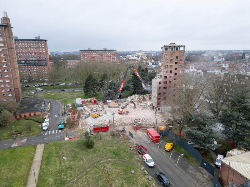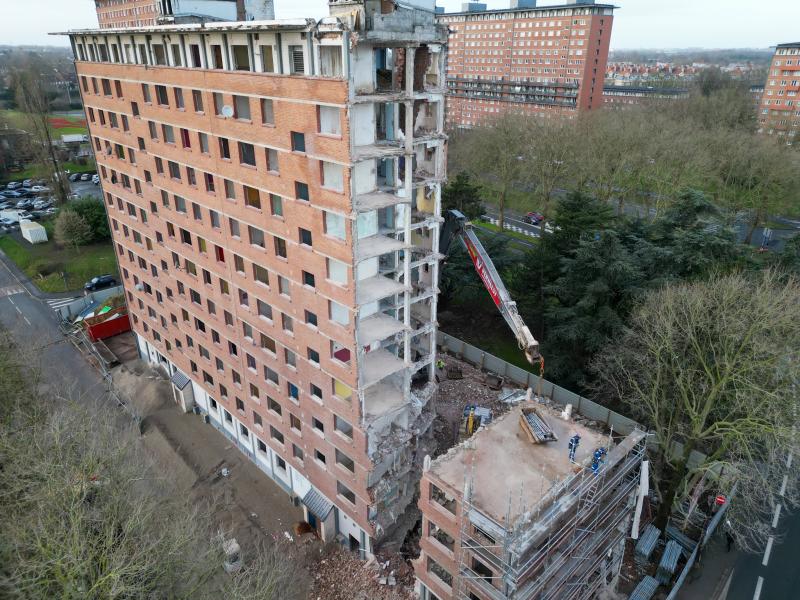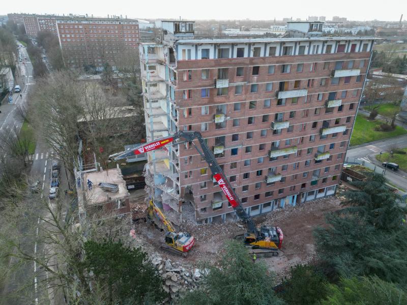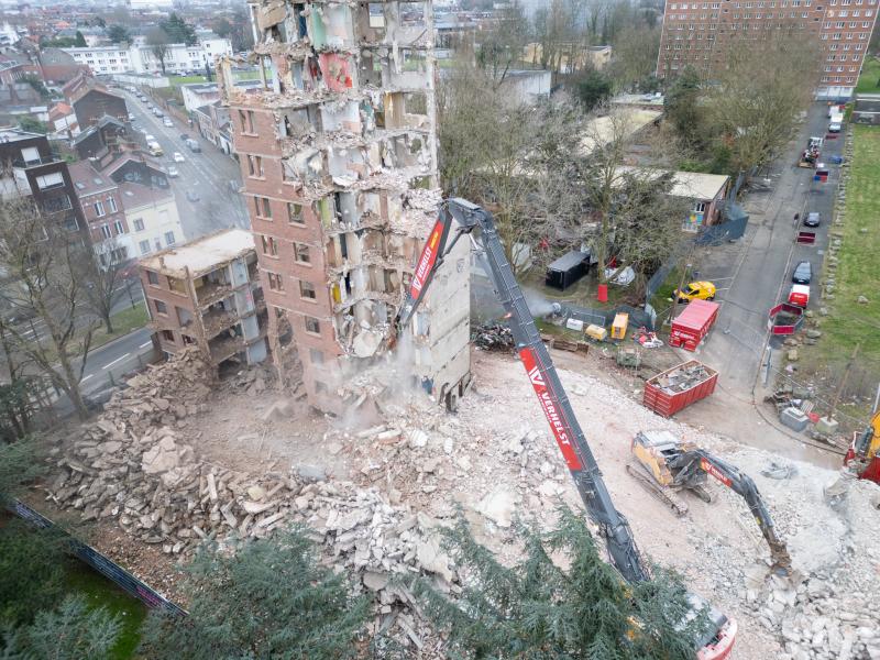 In samenwerking met ons zusterbedrijf Helfaut Travaux hebben we recent een uitdagend sloopwerk van een appartementsgebouw in Rijsel succesvol voltooid. De complexiteit van dit project lag niet zozeer in de grote hoogte van het gebouw, maar in de nabijheid van een drukke straat die tijdens de werkzaamheden open moest blijven voor verkeer.